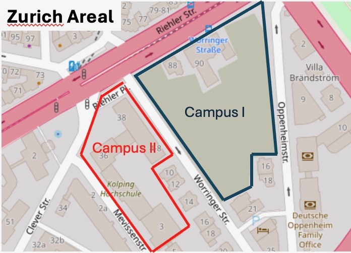 Das Areal zwischen Worringer Straße – Riehler Straße – Oppenheimstraße (Campus I) hatte die Agrippina Versicherung in den 1910er Jahren als neuen Standort für ihre Hauptverwaltung erworben. Es war Teil des ehemaligen Oppenheim-Anwesens.