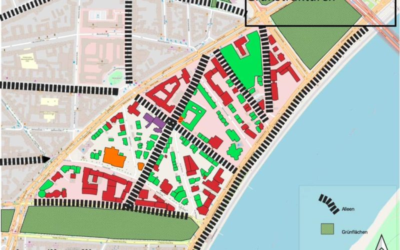 Das Villen-Viertel wird grün eingefasst im Norden durch den Skulpturenpark und im Süden durch den Theodor-Heuss-Park. Etwas Grün gibt es auch am Rheinufer.